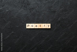Poetry word written on wood block. Poetry text on cement table for your desing, Top view concept