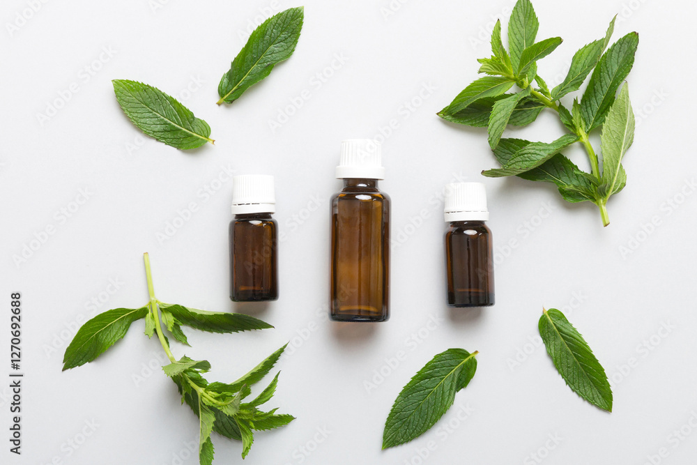 Natural Mint Essential Oil in a Glass Bottle. organic cosmetics with herbal extracts of mint on colored background