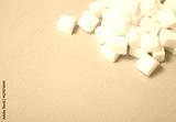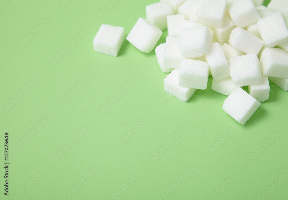 White sugar cubes arranged on a pastel green background with blank space below