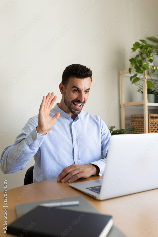 Vertical portrait of happy caucasian man waving hand on a business meeting video call at home office using laptop.