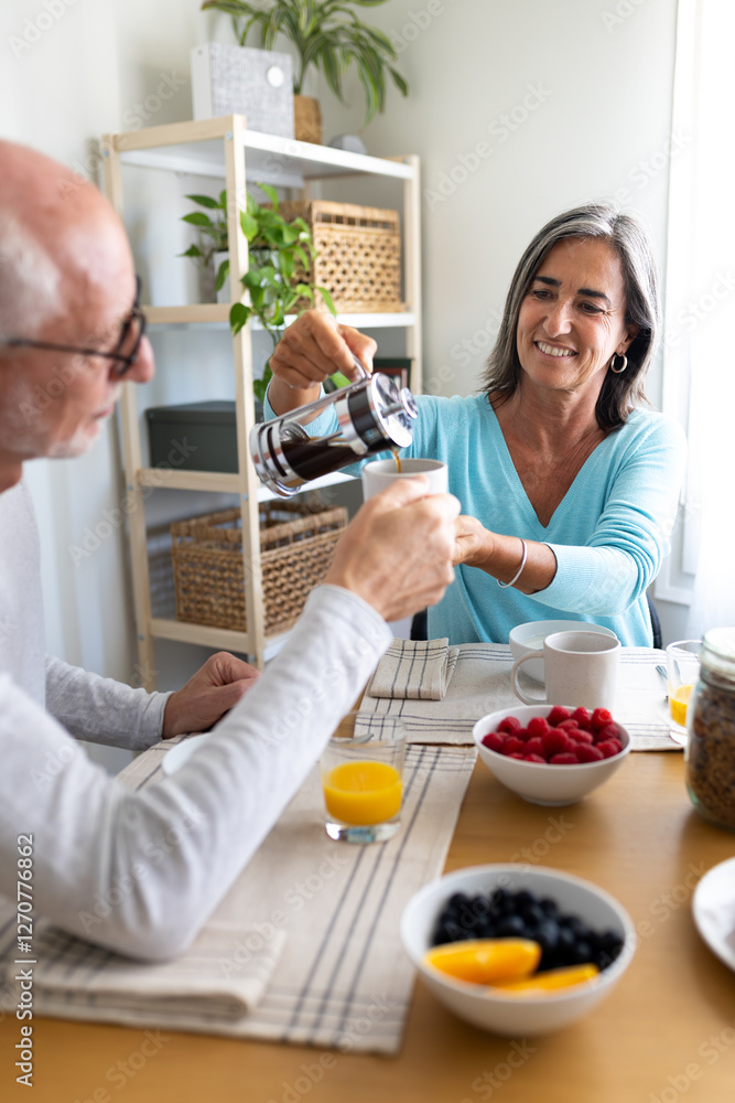 Vertical portrait of mature couple enjoying breakfast together at home dining room. Woman serving coffee to husband.