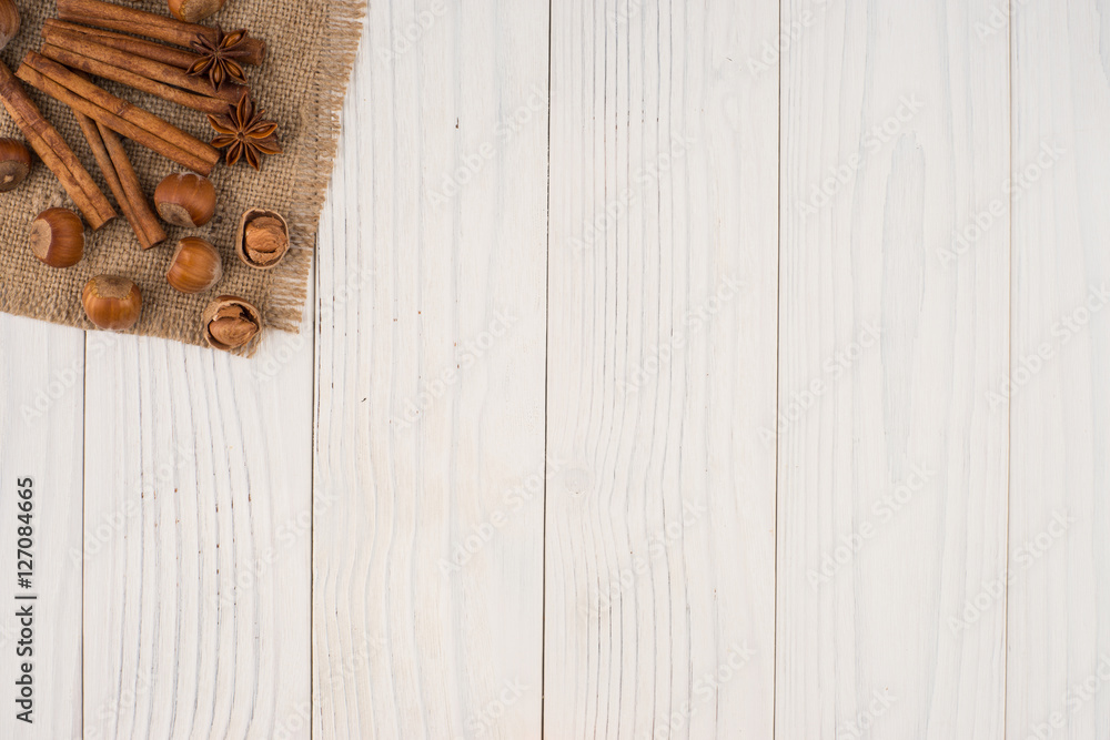 Cinnamon, star anise and hazelnuts on an old white wooden table.