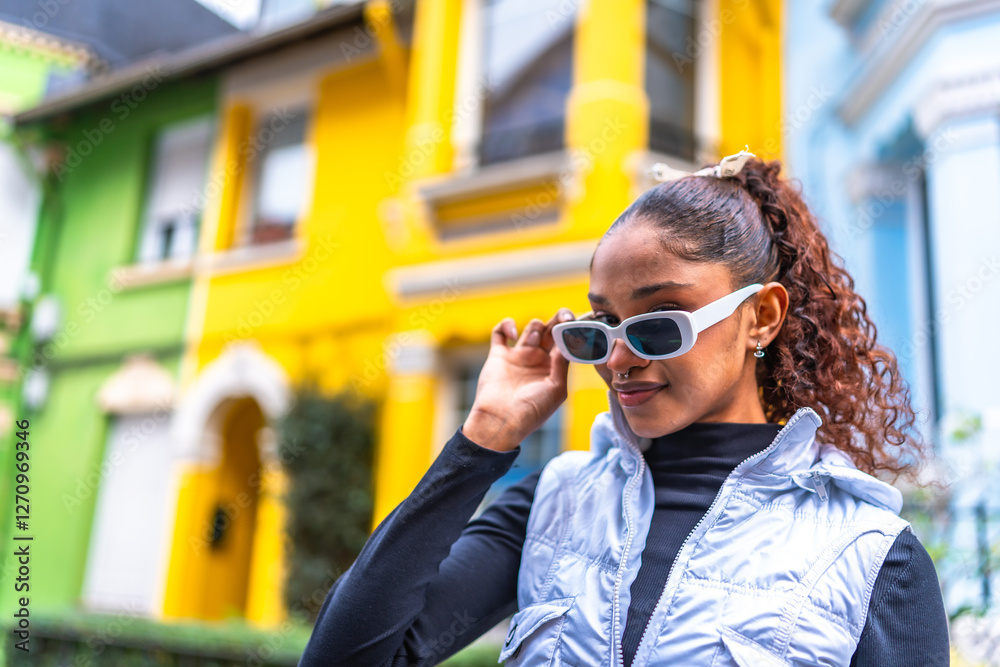 African american woman wearing modern futuristic clothes and sunglasses outdoors