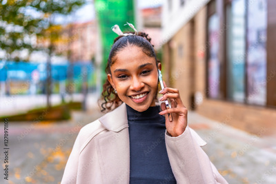 Happy african elegant woman talking to the mobile outdoors