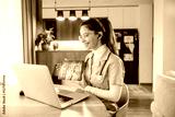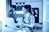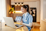 Smiling female doctor showing x-ray on tablet at laptop during consultations from home.
