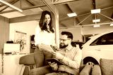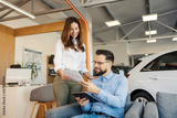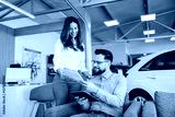 Saleswoman standing at car showroom and giving contract to a cheerful buyer.