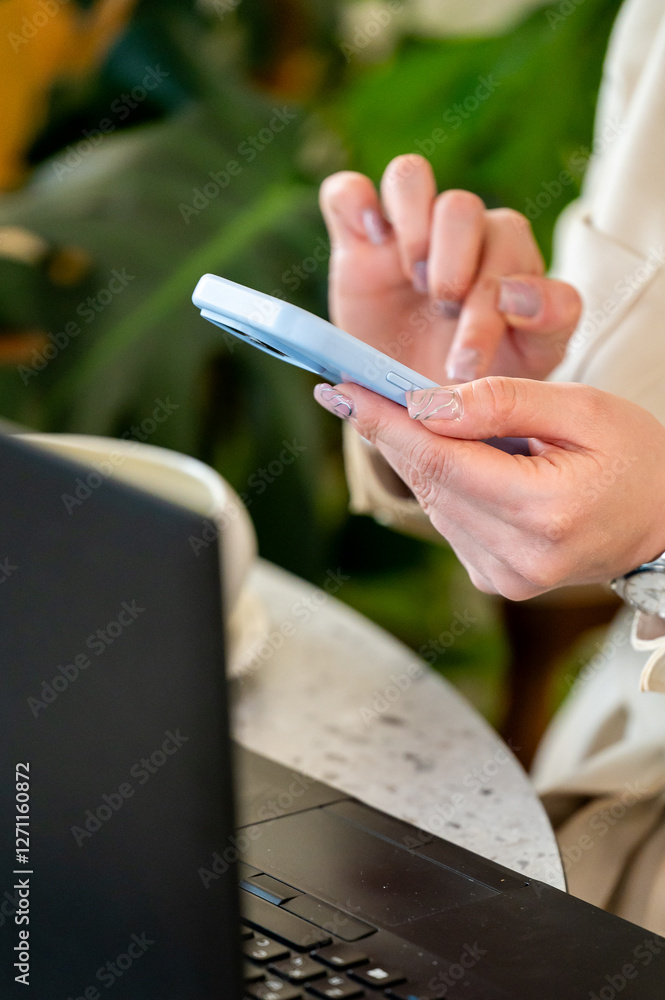A close-up of a person's hand using a smartphone while sitting at a table with a laptop, surrounded by lush green foliage. The scene conveys a modern and productive atmosphere.