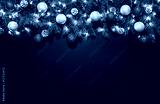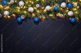 Christmas decoration background over black chalkboard, top view. Horizontal photo of decorations taken from above with copy space for text and other web or print design elements.