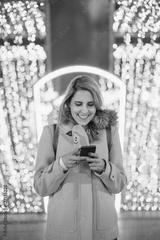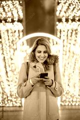 Young woman standing at the street and using mobile phone. Winter. Christmas street lights