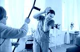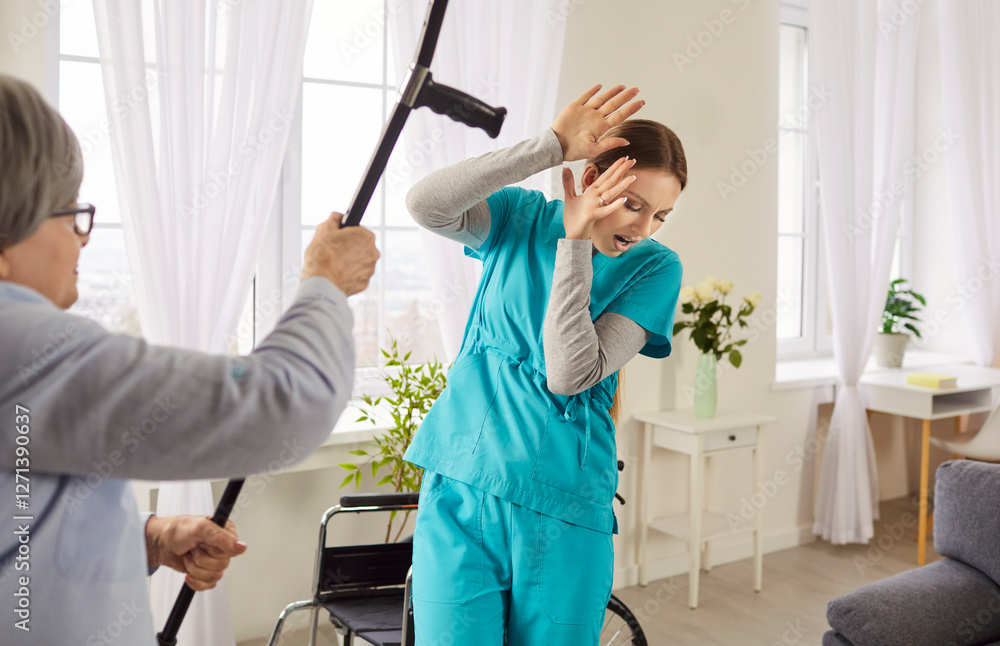 Aggressive elderly woman threatening with crutch to frightened nurse have disagreement being dissatisfied with medical help has bad mood mental problems feels furious. Old people care