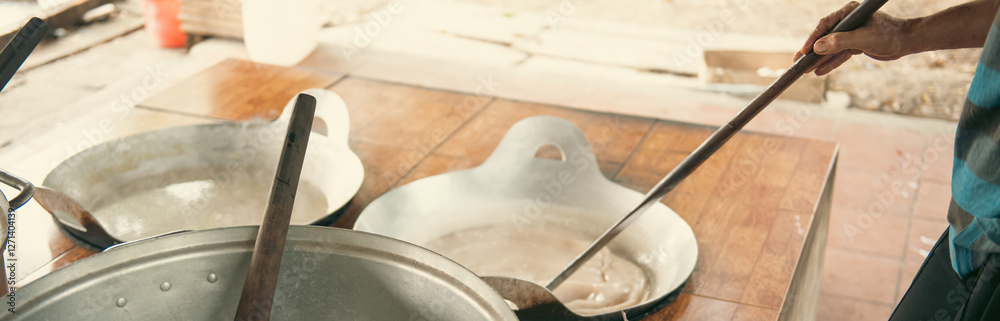 Panorama view man hand using stick stir mixture of squeezed coconut milk, cream, sugar, malt syrup in flat cast iron cooking pan at local handmade candy factory in Can Tho, Vietnam, authentic