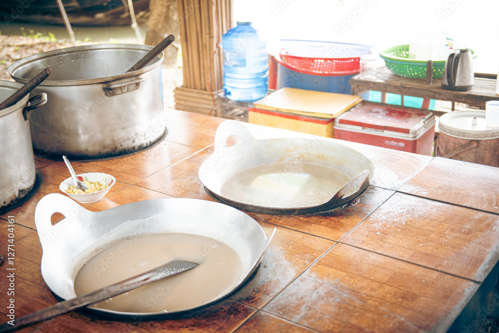 Natural ingredients squeezed coconut milk, cream, sugar and malt syrup in flat cast iron cooking pan at local handmade candy factory in Can Tho, Vietnam, glutinous rice flour in food production