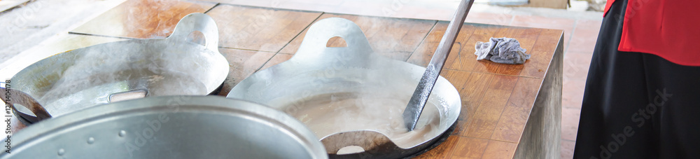 Panorama view lady hand using stick stir mixture of squeezed coconut milk, cream, sugar, malt syrup in flat cast iron cooking pan at local handmade candy factory in Can Tho, Vietnam, authentic
