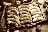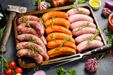 Metal tray with a set of uncooked meat sausages for BBQ. Top view. On a dark background.