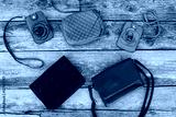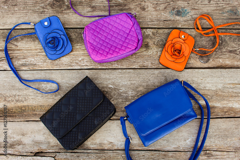Colored handbags on wooden background. Top view.