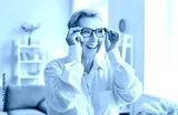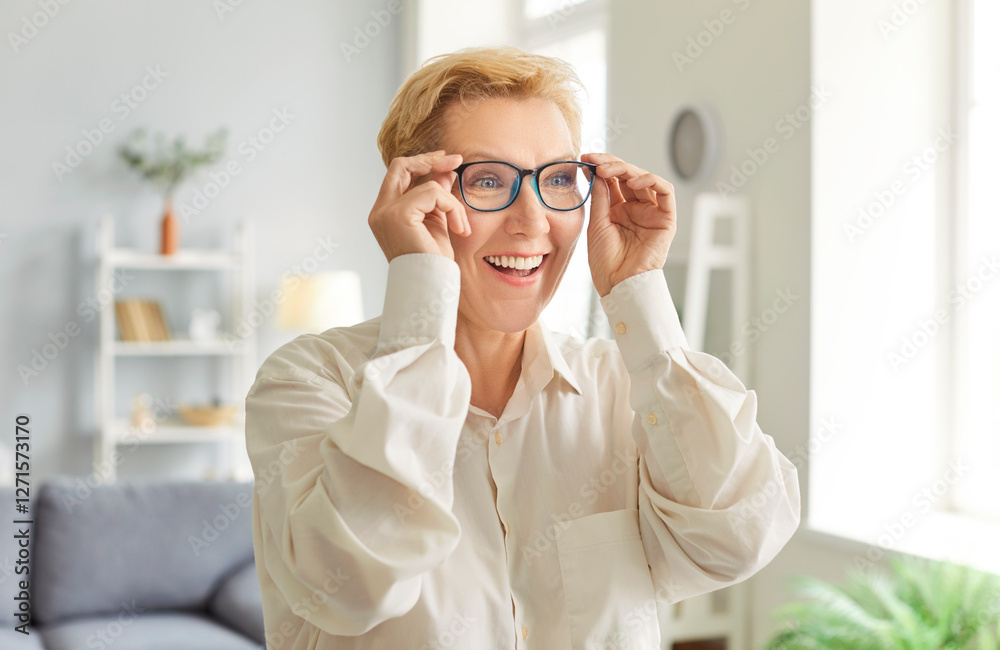 Happy older woman in elegant glasses looking with beautiful toothy smile, laughing enjoys correct eyeglasses, medical vision service, solving vision problems, testing, optical store advertisement