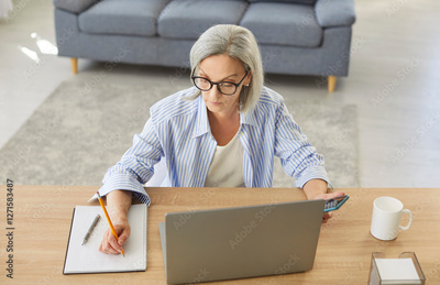 Senior woman working from home. Mature grey haired lady in eyeglasses sitting at desk in living room, using laptop computer and mobile phone and writing in notebook. From above, high angle shot