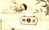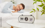 Man sleeping in cozy bedroom while an alarm clock shows 7 a.m., signaling an early morning wake up. The clock rings beside the bed, emphasizing time and morning routine in a cozy home.
