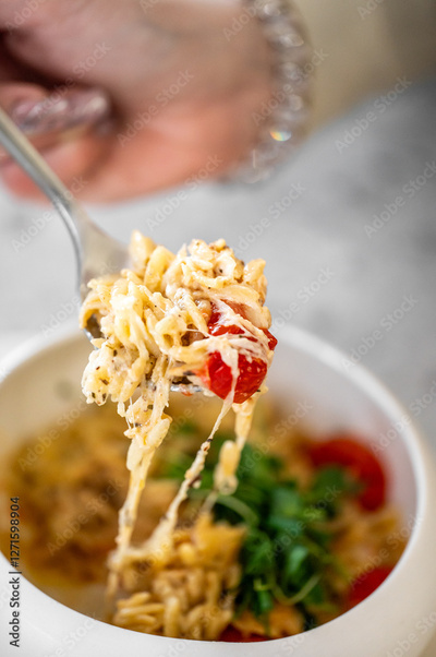 A close-up of a hand holding a forkful of cheesy pasta with cherry tomatoes, fresh herbs, and a creamy sauce, served in a white bowl.