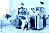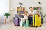 Family tourist summer vacation happy packing suitcase together at home planning, preparing for travel, recreation, parents, daughter dreaming of enjoyment or sea, going on leisure trip, summer journey