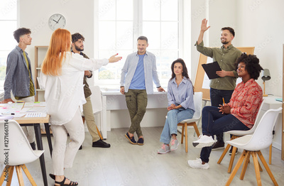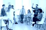 Group of business people participate in a meeting or presentation in the office, raising hands to ask questions. The team collaborates professionally in a work environment with colleagues.
