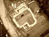 Drone top down view of a large, detached home seen with a detached garage on a former greenbelt site in rural Essex, UK. Seen nearly completed and to be released for a private sale.