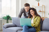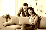 Young family couple sitting at home, sofa looking smiling at laptop screen, happy young married spouse web surfing, making purchases online booking flight tickets, reading good news, leisure time