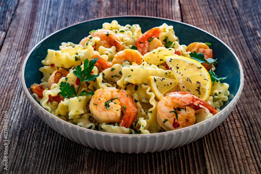 Pasta with seared shrimps, garlic and parsley on wooden table