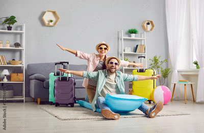 Happy funny married couple going on vacation together. Cheerful excited young man and woman in summer clothes sitting on water mattress in living room with their baggage. Holiday, travel concept