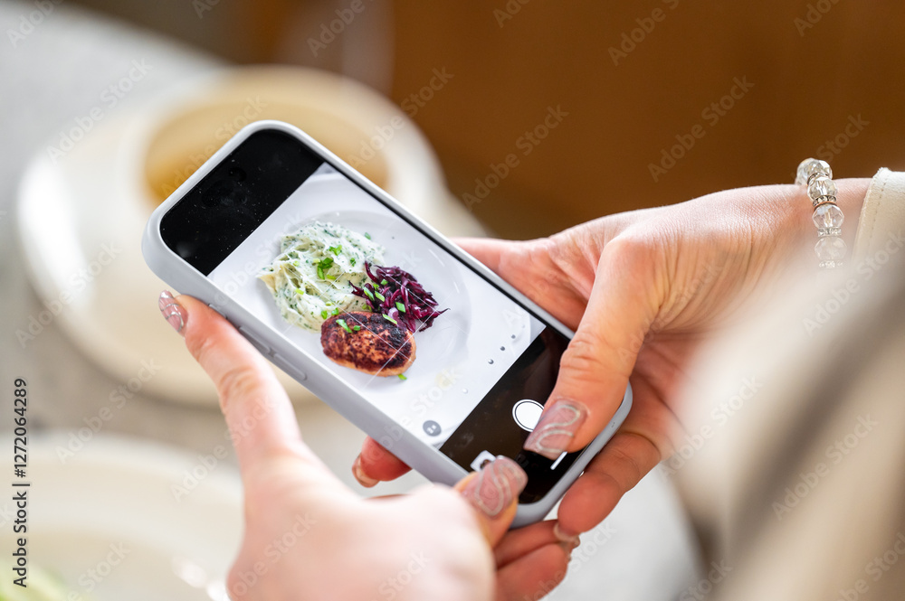 A close-up of a smartphone displaying a photo of a plated meal, while a person holds the phone. The dish features greens and a meat patty, emphasizing food photography