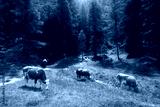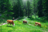 Brown and white cows grazing on a vibrant green meadow filled with yellow wildflowers in green forest in alpine mountains. Funny cute cows in Dolomites, Italy. Nature and animals. Alps