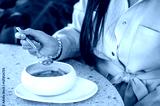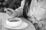 A close-up of a woman’s hand holding a spoonful of soup from a stylish bowl. The setting features modern decor, emphasizing a cozy dining experience.