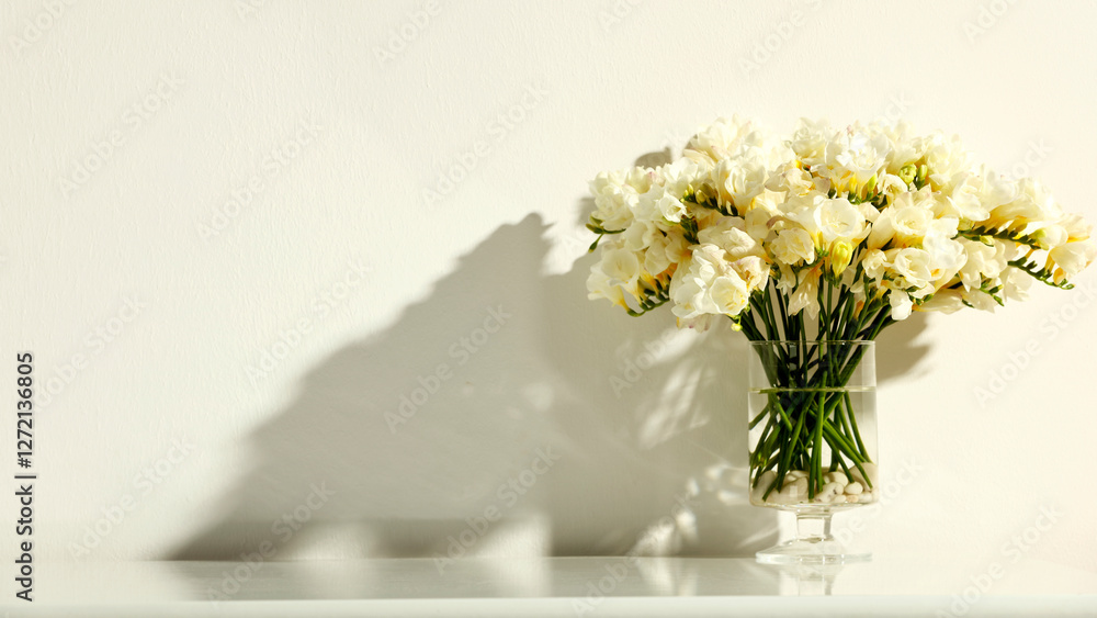 Flowers in a vase on white cupboard with white wall background. Natural daily sunlight and shadows background.