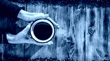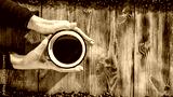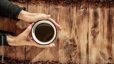 Female hands holding a cup of coffee. Wooden table background and top view.