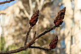 Branches adorned with vibrant red buds herald the arrival of spring, contrasting beautifully with the city buildings behind