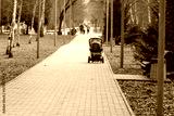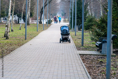 Parents stroll through a peaceful park on a cool day, guiding strollers along a paved pathway surrounded by greenery