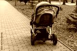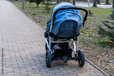 A stroller is parked on a brick path in a tranquil park surrounded by trees on a clear, sunny day inviting outdoor relaxation