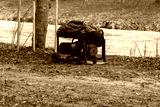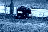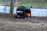 A portable generator is set up on a muddy bank next to a river, covered with a tarp, ready for power needs in an outdoor setting