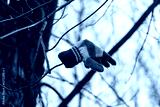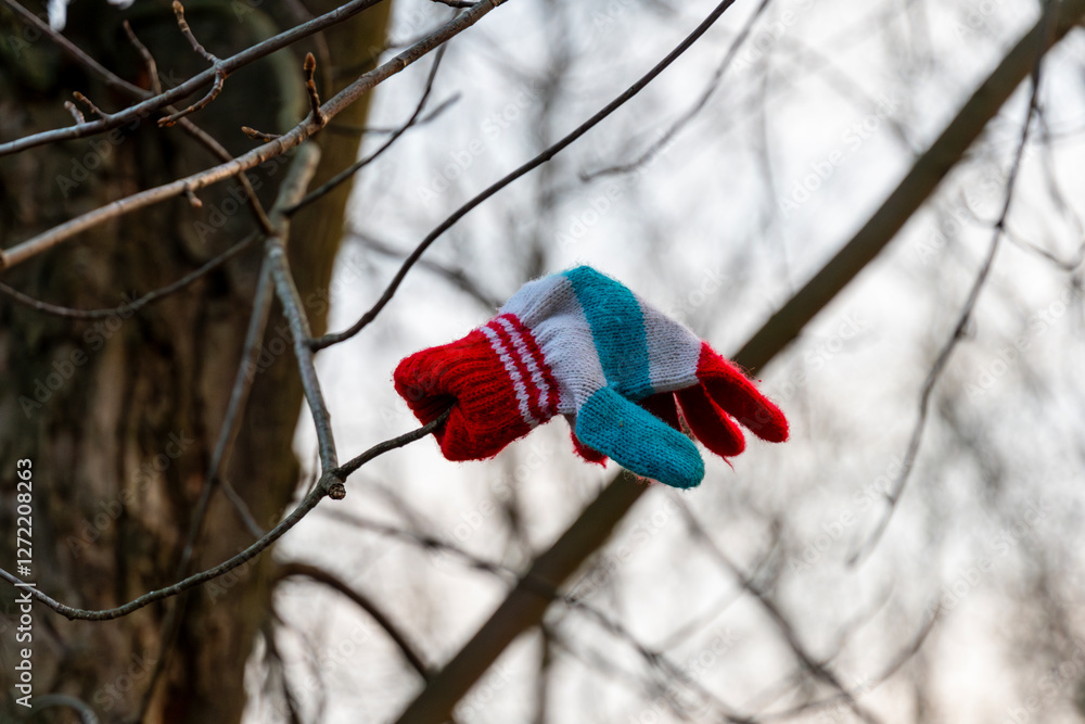 A bright red, white, and blue glove is stuck on a bare tree branch, illuminated by the soft light of dusk in winter