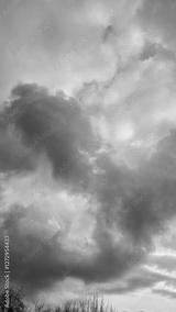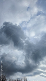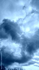 Blue sky with clouds, winter weather. Clouds on the background of trees.
