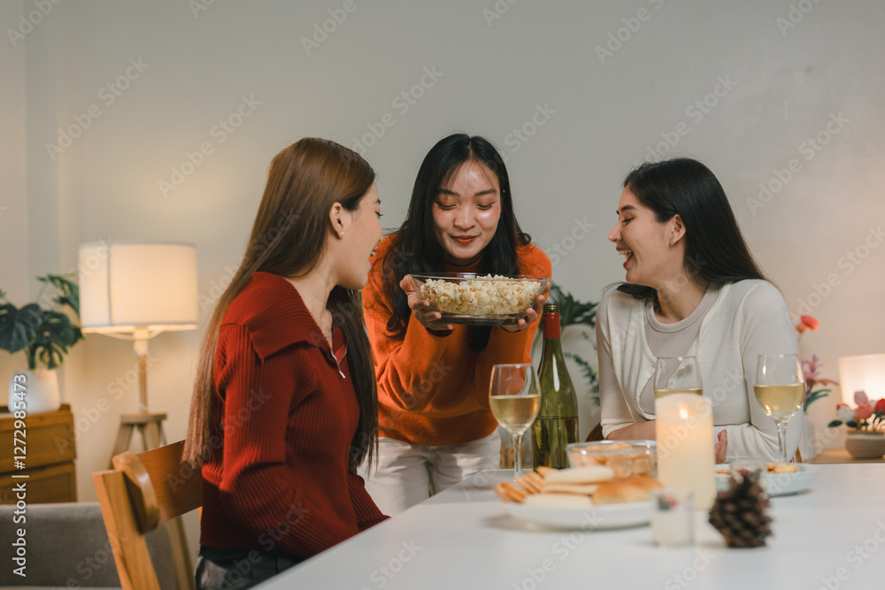 Three friends gather around a dining table, sharing a home-cooked meal in a warm and inviting atmosphere. Laughter and conversation flow as they enjoy their time together