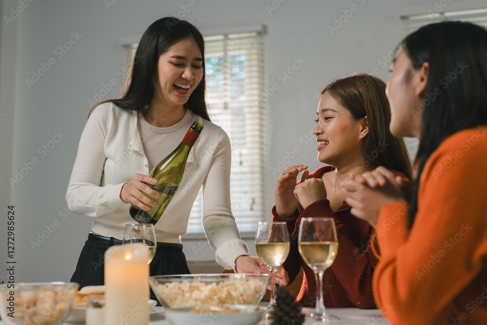 Three women sharing laughter and conversation while enjoying wine and snacks around a table, creating a warm and friendly atmosphere in a cozy living room