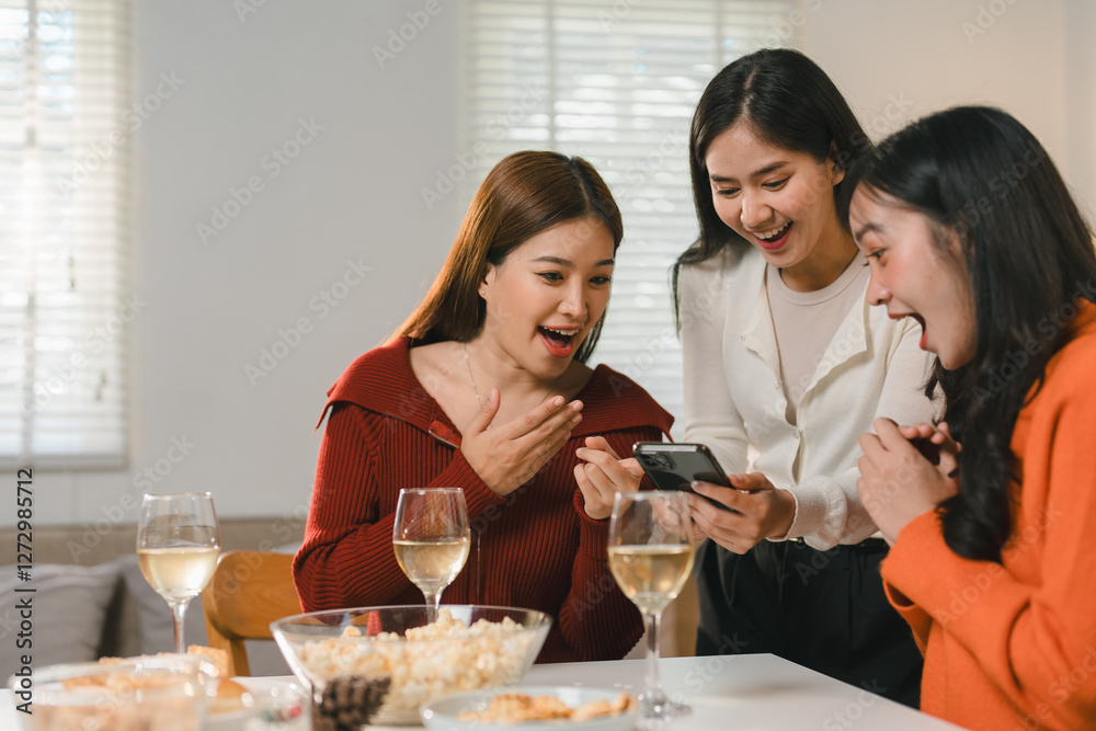 Three women gather around a table, sharing excitement while looking at a smartphone. Laughter and surprise fill the room, with wine glasses and snacks creating a cozy atmosphere