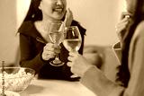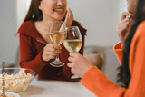 Two friends share a relaxed moment, clinking glasses of white wine while enjoying a casual chat. A bowl of popcorn sits nearby, adding to the cozy atmosphere