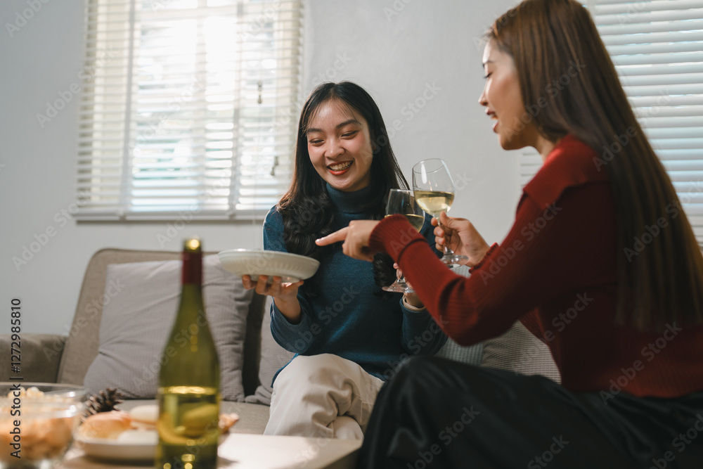 Two women sharing a joyful moment, sipping wine and enjoying snacks in a cozy living room. The scene captures warmth, friendship, and relaxation during a casual gathering