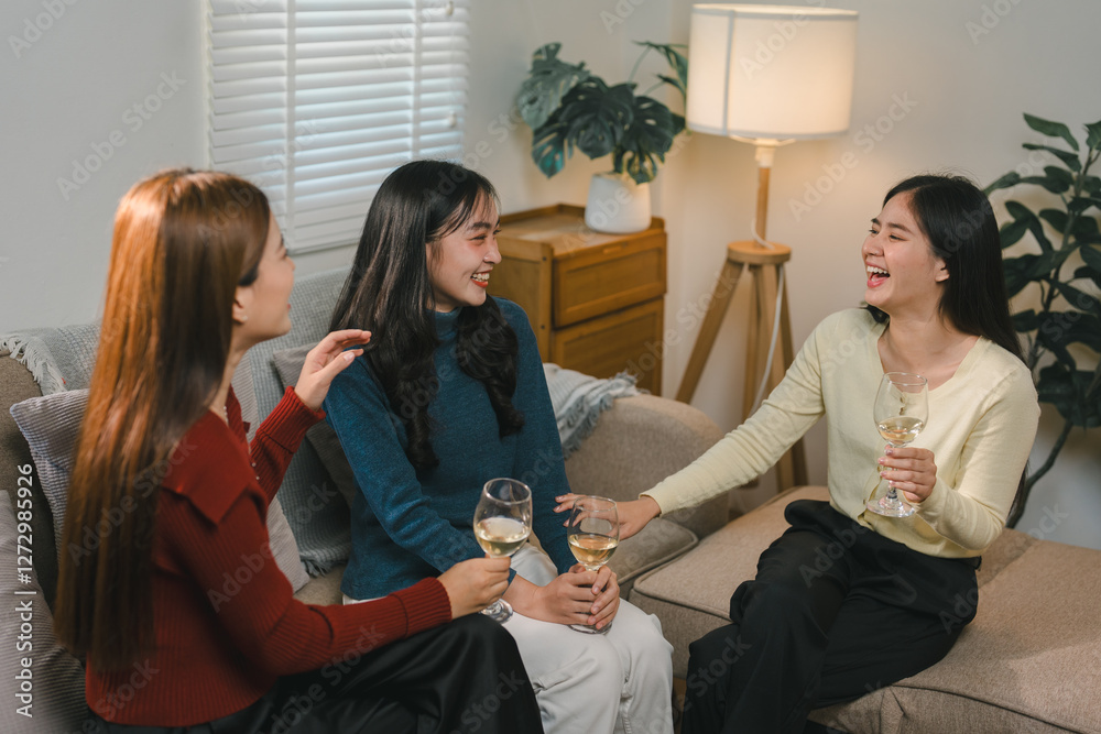 Three women are sitting on a couch in a warmly lit living room, sharing laughter and conversation while holding glasses of white wine, creating a cheerful and relaxed atmosphere