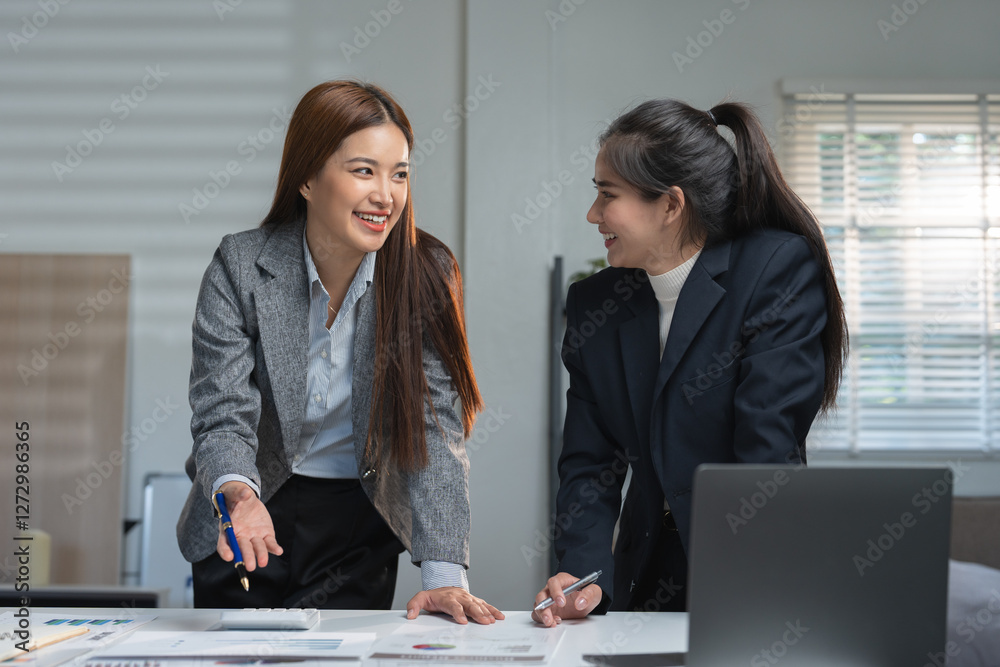 Two professional women engage in a collaborative discussion at a modern office, reviewing documents and ideas, fostering teamwork and innovation in a corporate environment