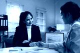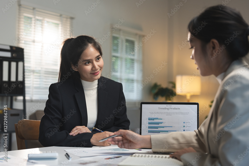Two professional women in a modern office setting engage in a discussion, analyzing charts and graphs on a laptop. The atmosphere is collaborative and focused on business growth