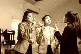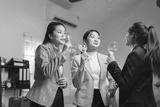 Three professional women in an office setting enjoy a casual social gathering with wine, fostering camaraderie and relaxation after work. The atmosphere is friendly and engaging