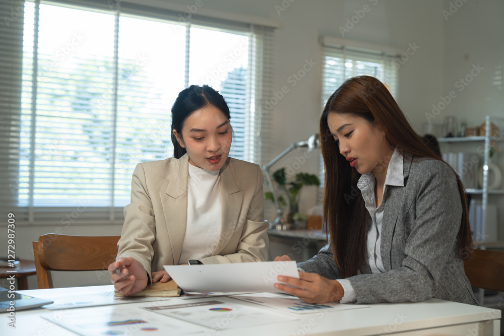 Two professional businesswomen discussing documents at a desk in a modern office setting. Bright natural light filters through the window, creating a productive and focused atmosphere